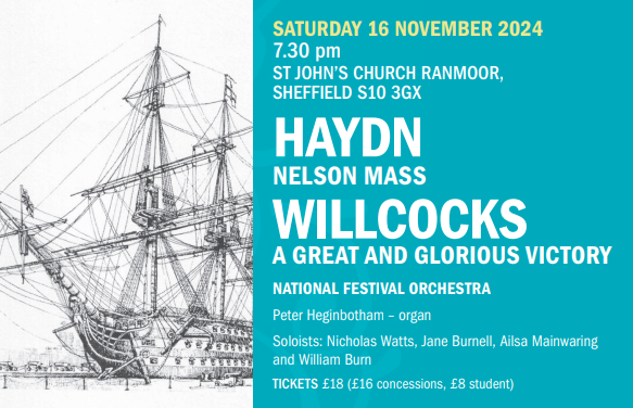 Sheffield Bach Choir opened the season with Haydn’s wonderful Nelson Mass, written in 1798 when Haydn was nearing the end of his life and at the peak of his powers. Austria had been defeated by Napoleon in four battles at the time of writing, and Haydn referred to the work as ‘A Mass for troubled times’. However, Nelson defeated Napoleon shortly before the first performance, and this coincidence led to the name by which the work became widely known. The opening depicts danger and agitation, while the drama of later movements calls to mind triumphant victory.